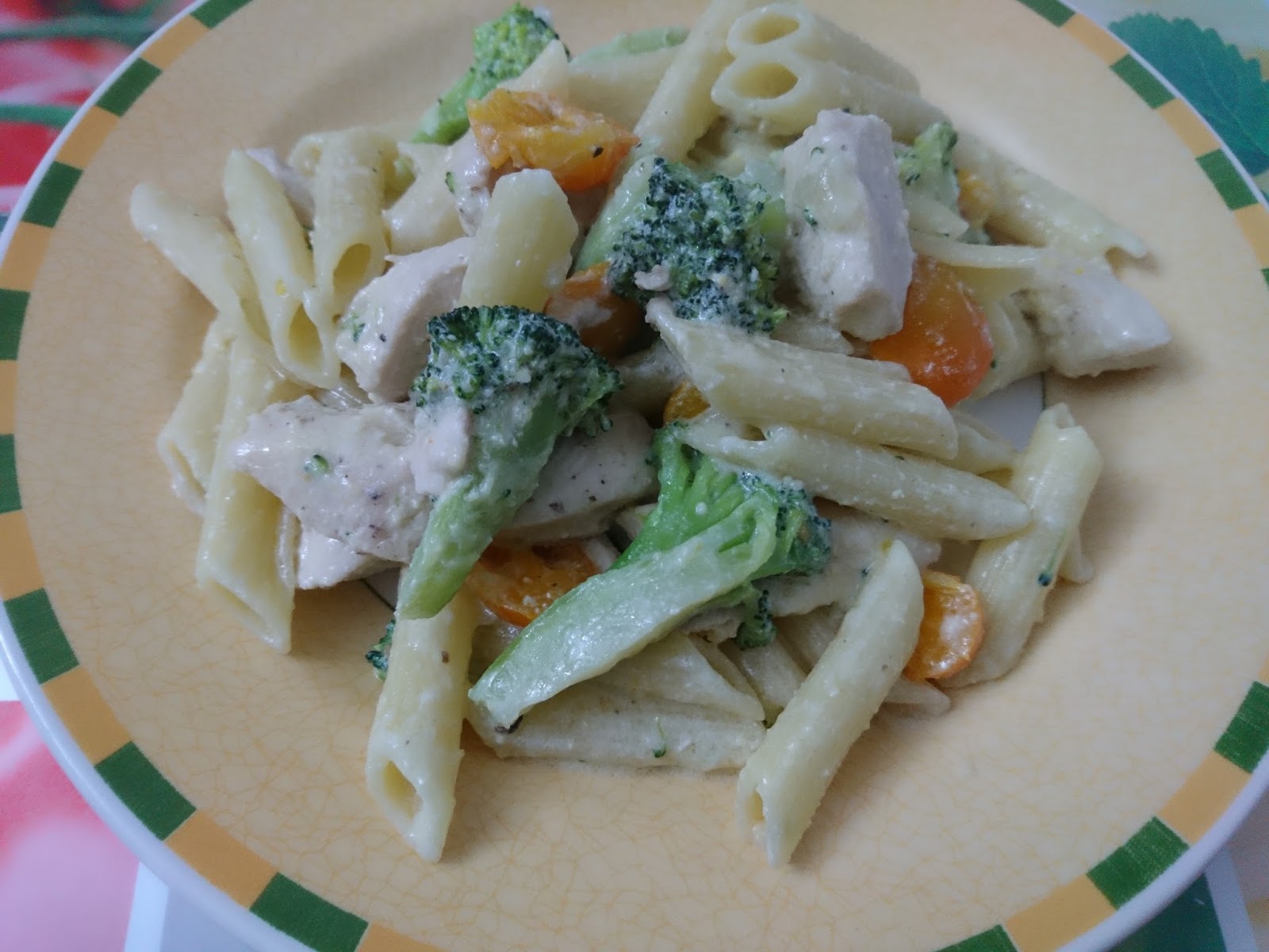 Adicionar a massa, assim como os brócolos, os tomates-cereja, a mistura do frango juntar as natas e envolva tudo bem deixe ao lume uns minutos junte o queijo  ralado.